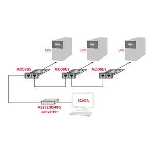 Die Modbus-Karte ermöglicht die Kommunikation zwischen mehreren USVs und dem Host-System (z. B. SCADA) über den RS-485-Bus. Jede USV ist mit einer speziellen Modbus-Karte ausgestattet, die eine Kommunikationsschnittstelle bietet. Die Daten werden von den Geräten über einen RS232/RS485-Konverter zur weiteren Verarbeitung und Analyse in Echtzeit an einen Computer gesendet.